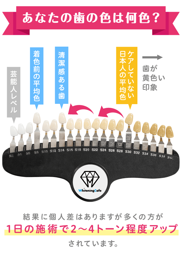 歯の本数による料金アップはありません。お口を開けて、見える範囲すべてのホワイトニングで一律料金です。効果の出方には個人差がございますが、1回の施術で2~4トーン白くなる方が多くいらっしゃいます。
